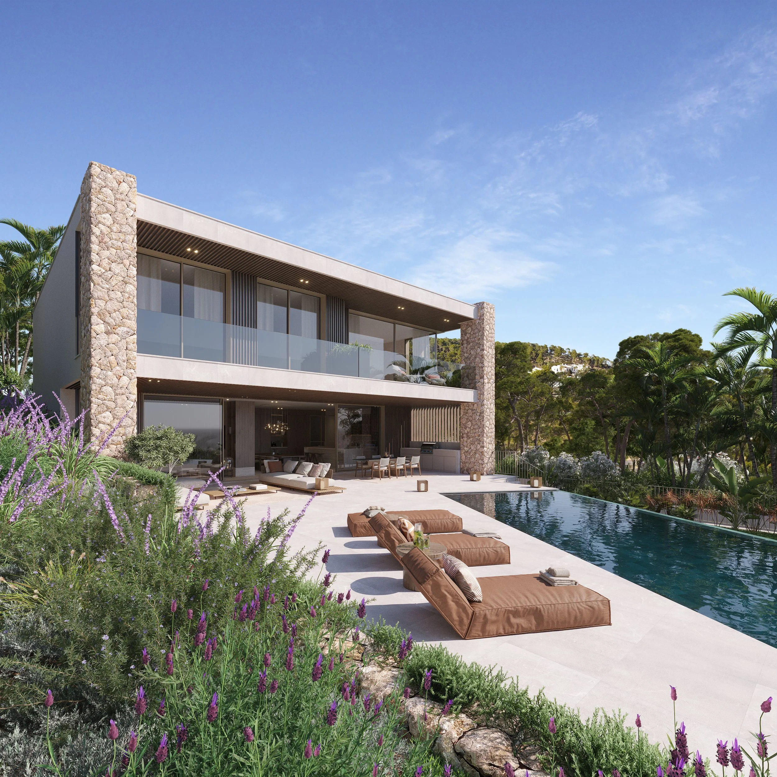 On the ground floor, the open living dining area has a natural flow out to the covered terrace, chill-out lounge, and swimming pool. The open living area with the kitchen and dining area is located with direct access to the terrace overlooking the sea views. The first floor is devoted to the bedrooms, with a big master suite with its own walk-in closet and bathroom as well as 3 comfortable bedroom suites.